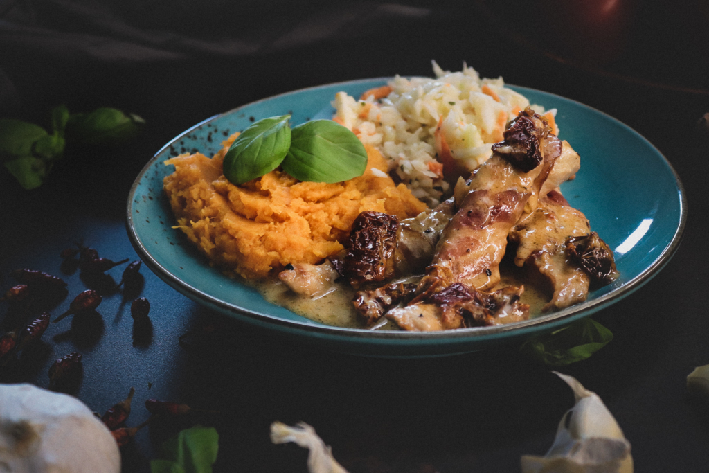 Na tą samą, osuszoną ręcznikiem patelnię wlać śmietankę. Dodać suszone pomidory pokrojone w drobną kostkę oraz zalewę spod nich. Doprawić solą, pieprzem i musztardą, a następnie zagotować przez około minutę na średnim ogniu. Dodać kurczaka z boczkiem i gotować przez kolejne 2 minuty. Udekorować świeżą bazylią. Serwować z batatami, ziemniakami lub frytkami oraz ulubioną surówką.