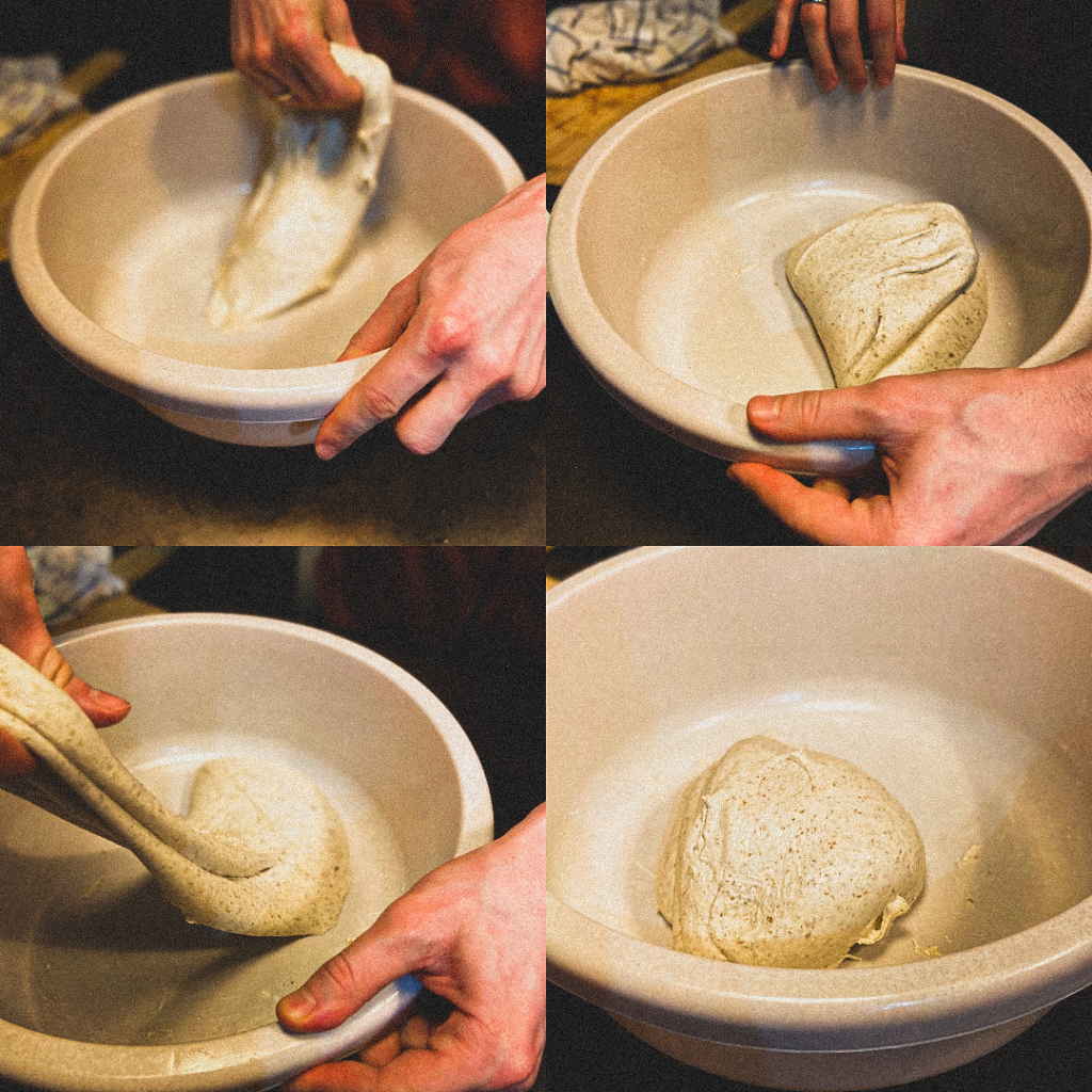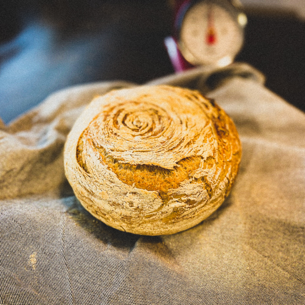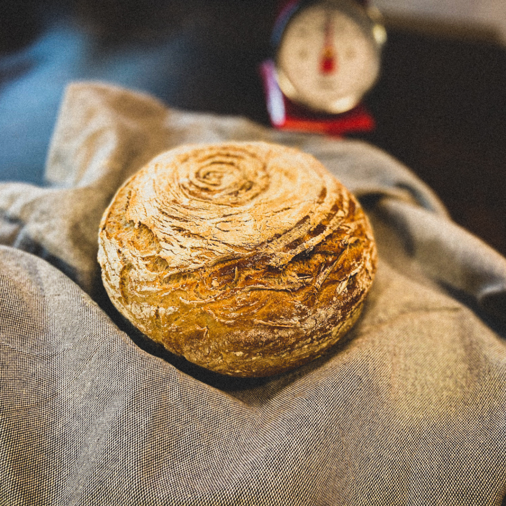 Piekąc chleb będziemy musieli zachowywać się nieco po aptekarsku, a także uzbroić się w odrobinę cierpliwości ale efekt jest zjawiskowy. Chleb zawsze wychodzi pyszny, z chrupiącą złotą skórką i naturalnymi pęknięciami, może też spokojnie leżeć pod czystą, lnianą ściereczką około tygodnia, zachowując swoje walory smakowe. Zaczyn należy zrobić na wieczór, a następnego dnia zagnieść ciasto i wykonać składanie. W naszym przypadku szybko stało się to miłym, domowym rytuałem i pozwoliło całkowicie zrezygnować z kupnego pieczywa.