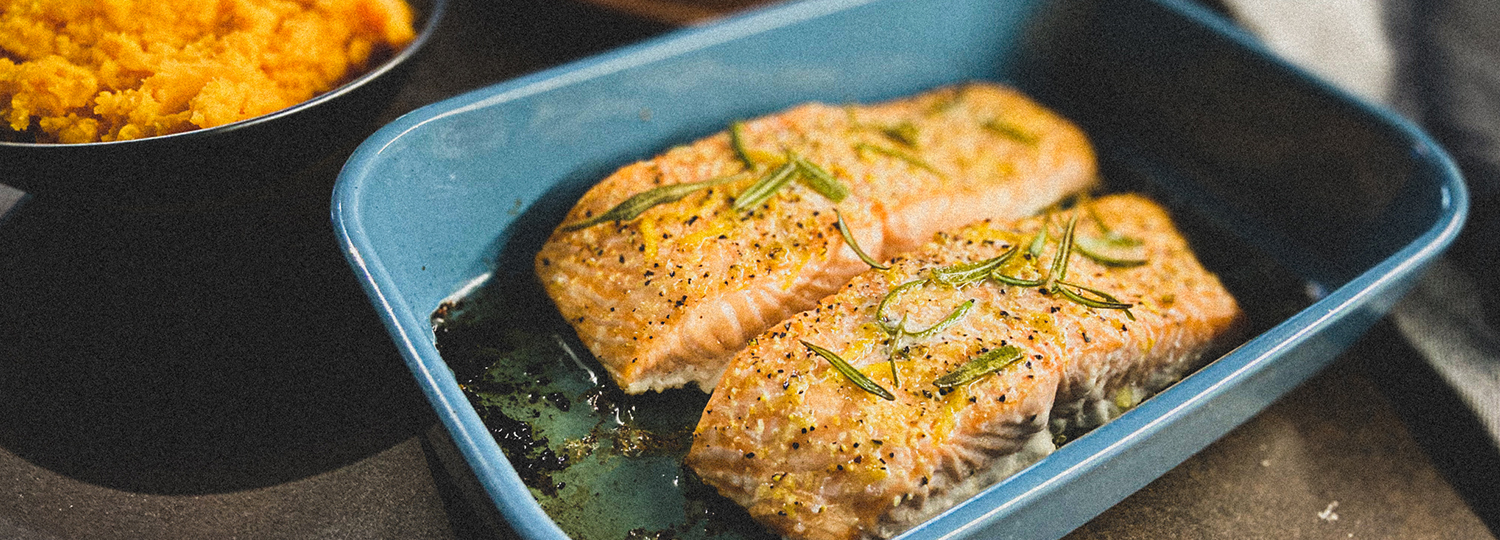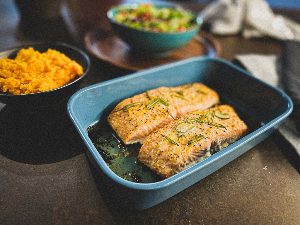Bardzo szybki i prosty przepis na pysznego cytrynowego łososia serwowanego na słodkich batach i z dodatkiem słodko-kwaśniej sałatki.